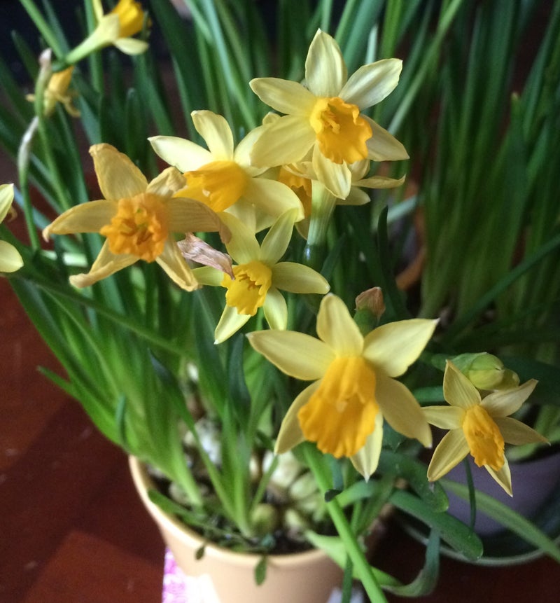 De narcisbolletjes zijn na een jaar in de tuin gestaan te hebben weer uitgekomen. Nu heb ik ze gezellig op de tafel in de kamer gezet.